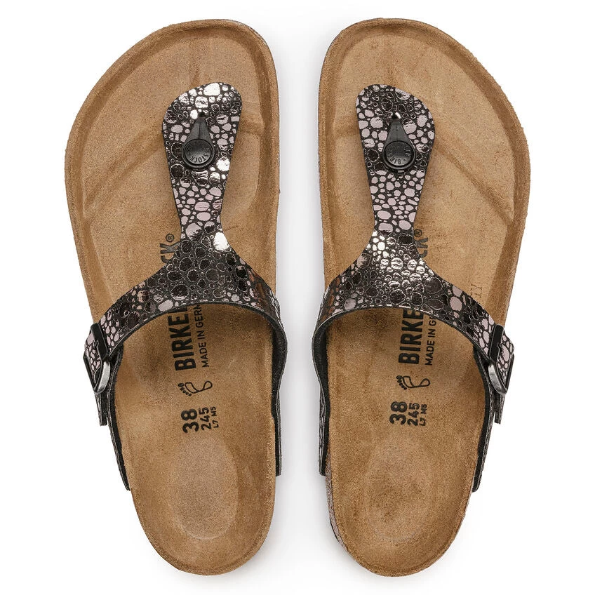 A contemporary thong sandal by BIRKENSTOCK is called the Gizeh. The Gizeh is a tried-and-true classic with recognizable support and a chic, minimalist design. This limited edition model is a part of our Metallic Stones line and has supple microfiber uppers with a gorgeous metallic pebble overlay. The material has a sophisticated tonal depth thanks to the contrast between the matte and shiny finishes. Suede in complementary colours lines the footbeds.