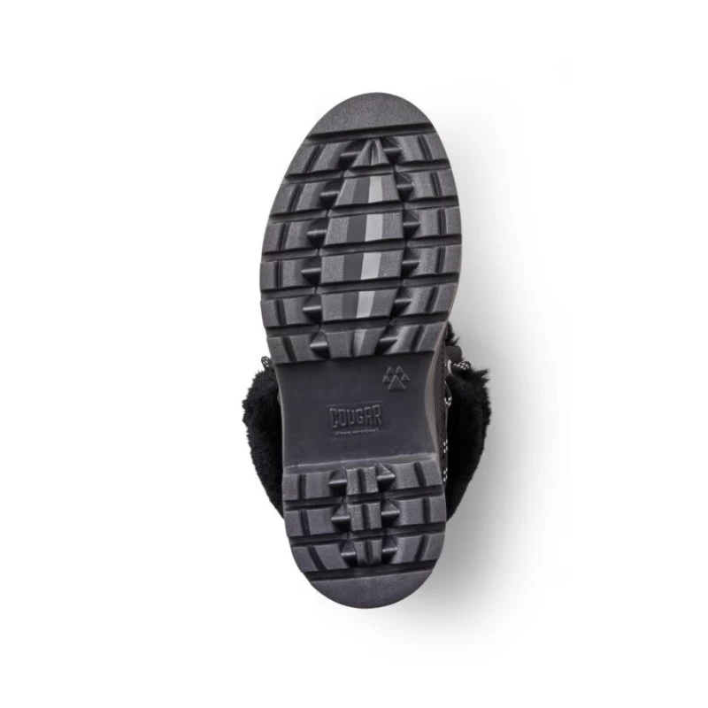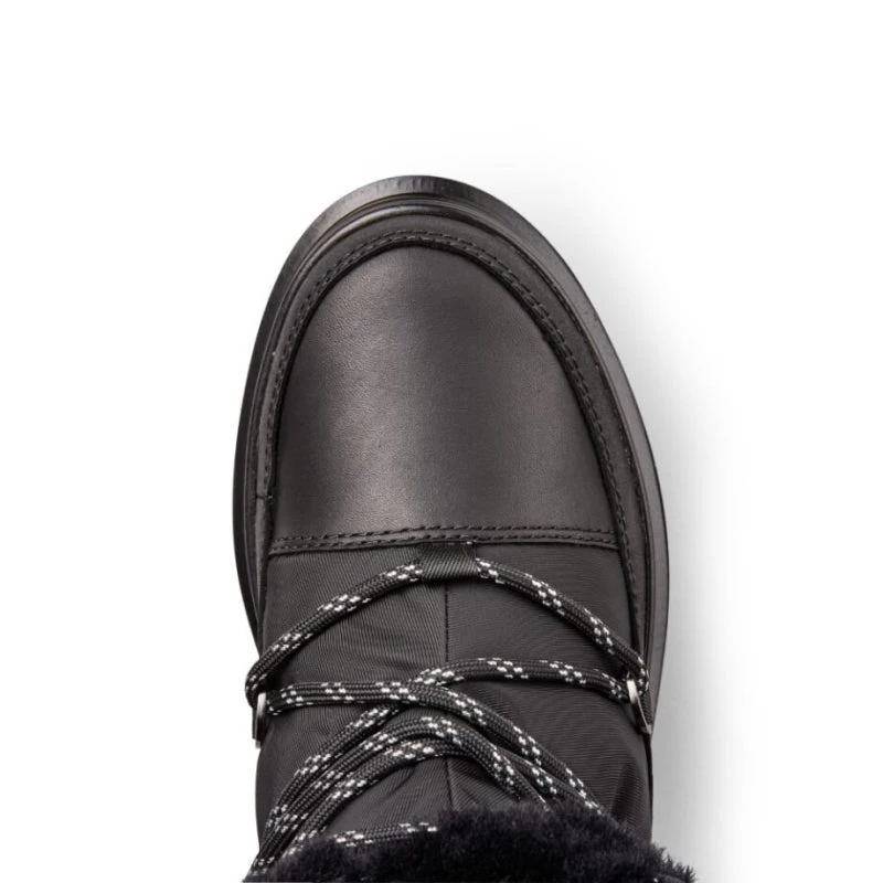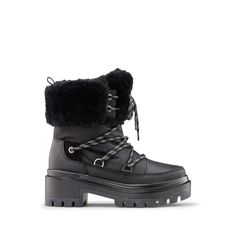 Mid height leather and nylon boot with faux shearling collar and tongue detail. Rounded toe. Front lace closure with metallic D-ring lashing points. Thermoplastic rubber outsole with polyurethane cushion midsole and 2 inch heel.