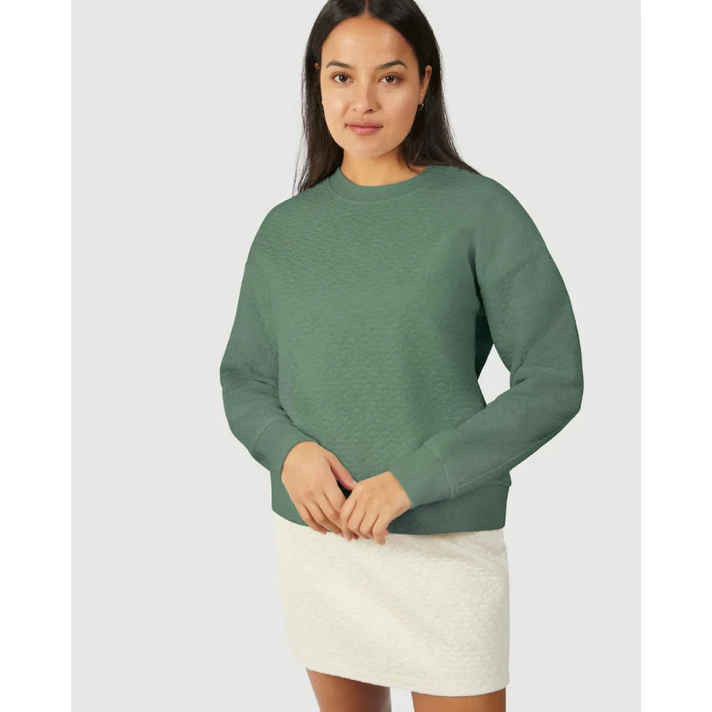 This sweater gives you the versatility you need to create a variety of looks with ease. Round neckline top made with Air-Quiltâ„¢, which is made with recycled polyester, created by using post-consumer plastic bottles. Top with dropped shoulder sleeves, rib knit details at the collar, cuffs and waistband, and back yoke.