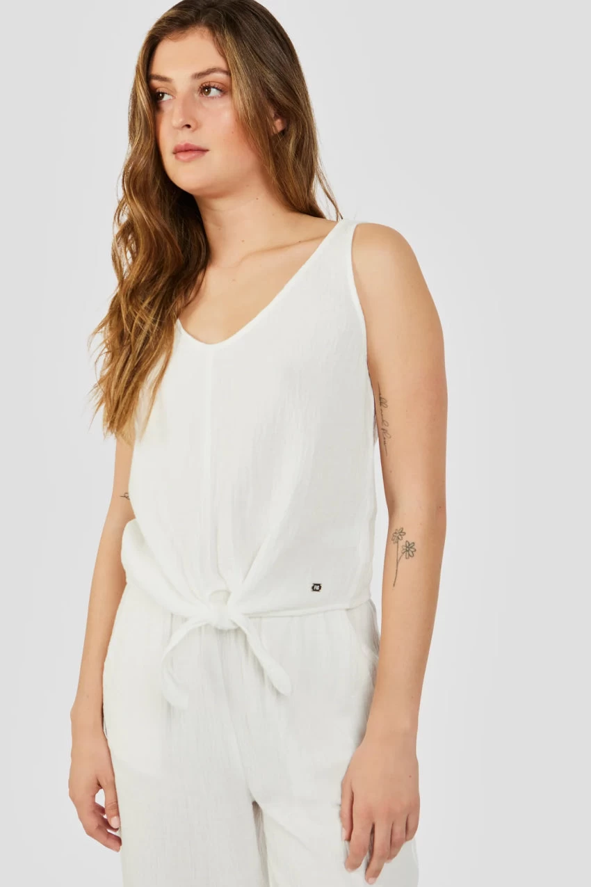 Scoop neck tank top with an adjustable tie at the front.