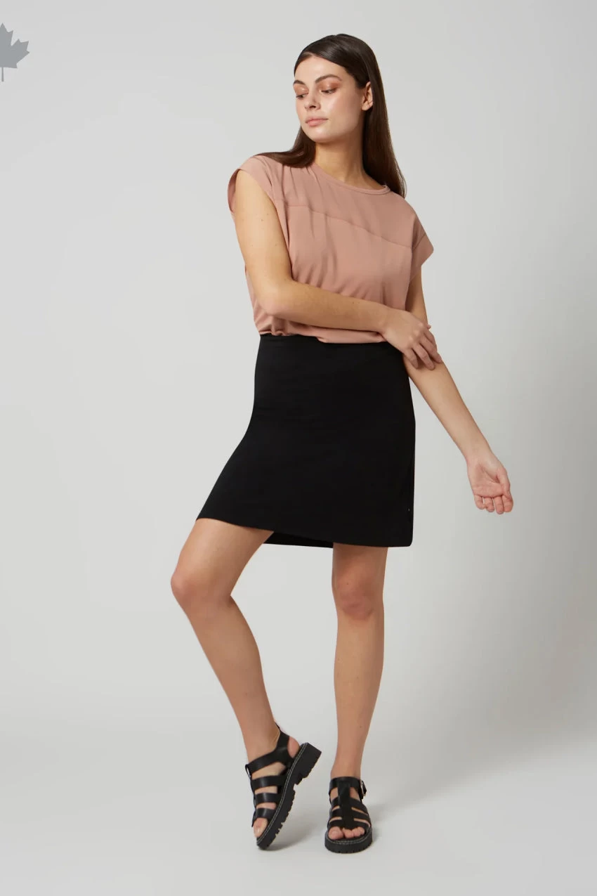 A-line knee length skirt made with organic cotton and TENCEL™ Lyocell, created using an environmentally responsible closed loop process, which transforms wood pulp into fibers. Mid-rise skirt with turn up waistband.