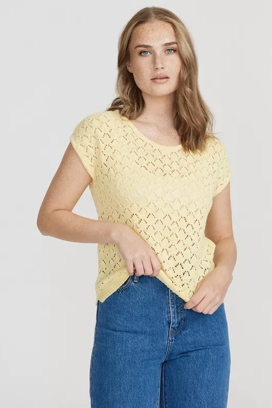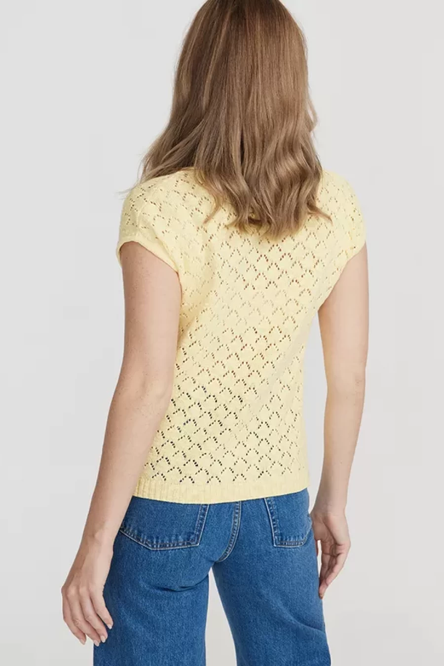This is a structure knitted sweater made of cotton “slub” quality. It has a relaxed fit and ribbed ending at the bottom.Â
