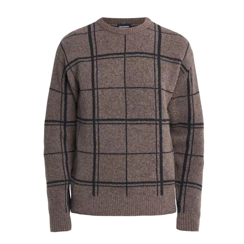 Heavy knitted sweater in soft merino wool blend that keeps you warm even on the coldest of days. Checked knitted pattern with ribbed details at neck, end of sleeves and at the bottom.Â
