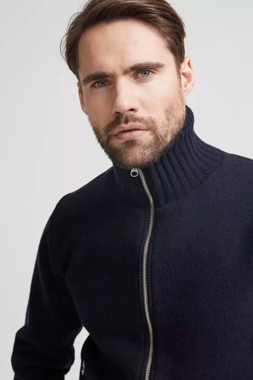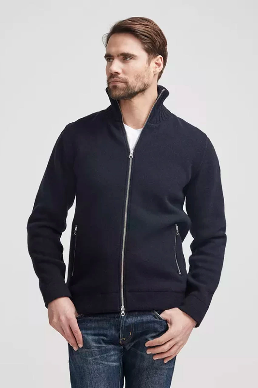 Knitted zip jacket in wool blend with a windproof lining. Two way metal zip with and pockets with metal zip. Straight fit and reinforced cuffs and hem. High ribbed collar with rib knit cotton inside. Elastic windproof lining (96% polyester, 4% elastane).