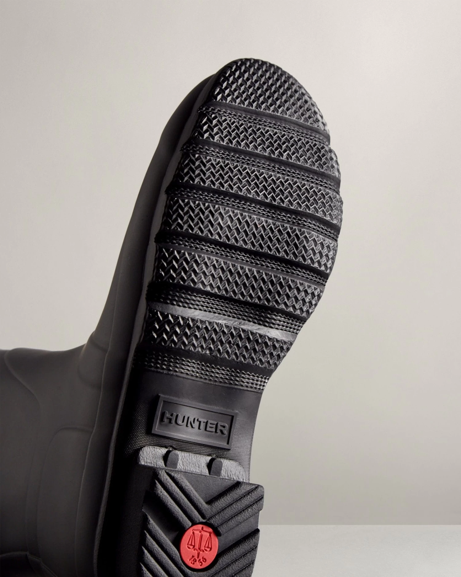 Perfect for wet weather conditions this women’s Rain Boot Boot is a shorter version of the iconic Hunter Original Tall Boot. Formed of natural rubber, each boot is handcrafted and assembled over three days before being vulcanized for superior protection. Featuring the Hunter Original tread pattern, and a comfortable polyester lining, this black waterproof boot is a rainy-day necessity.