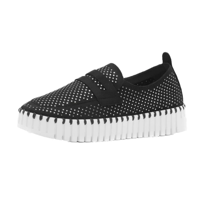 The platform Tulip shoe from Ilse Jacobsen is the perfect flat for all seasons! Crafted of recycled microfiber with a decorative laser cut pattern, this wonder shoe pairs easily with everything from denim to dresses.