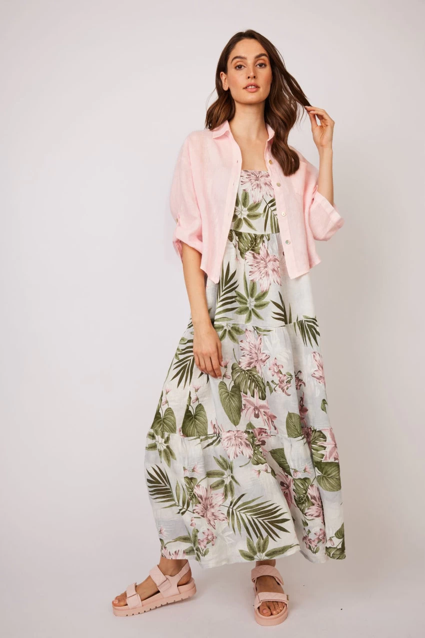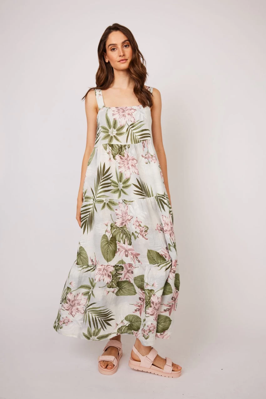 Floral printed, linen maxi tank dress.Â