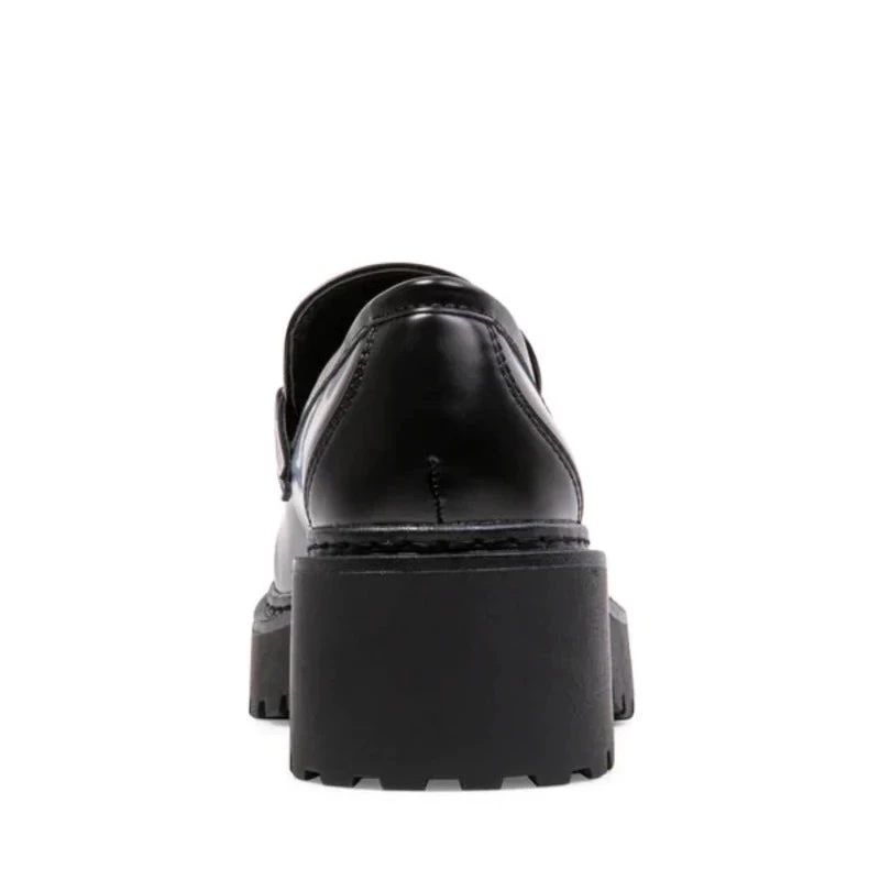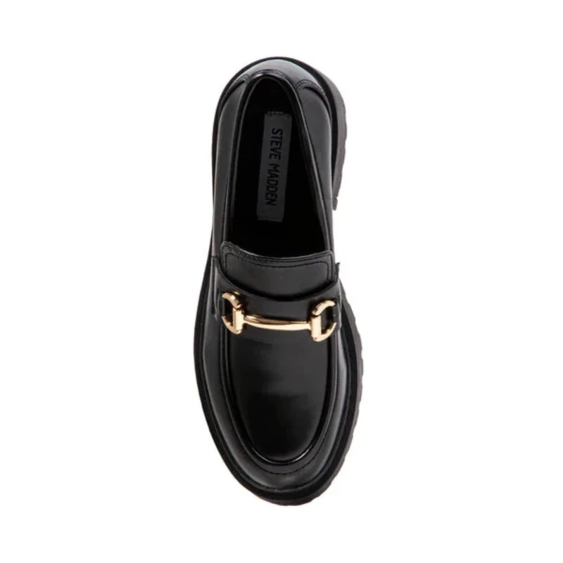 A sturdy block heel perfectly lofts these sleek and minimalistic women’s Steve Madden Approach black Loafer that feature contrast horse bit hardware for a bold look.Â