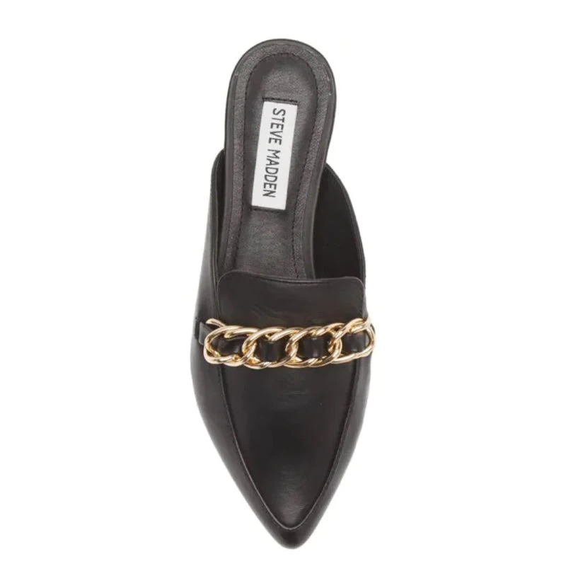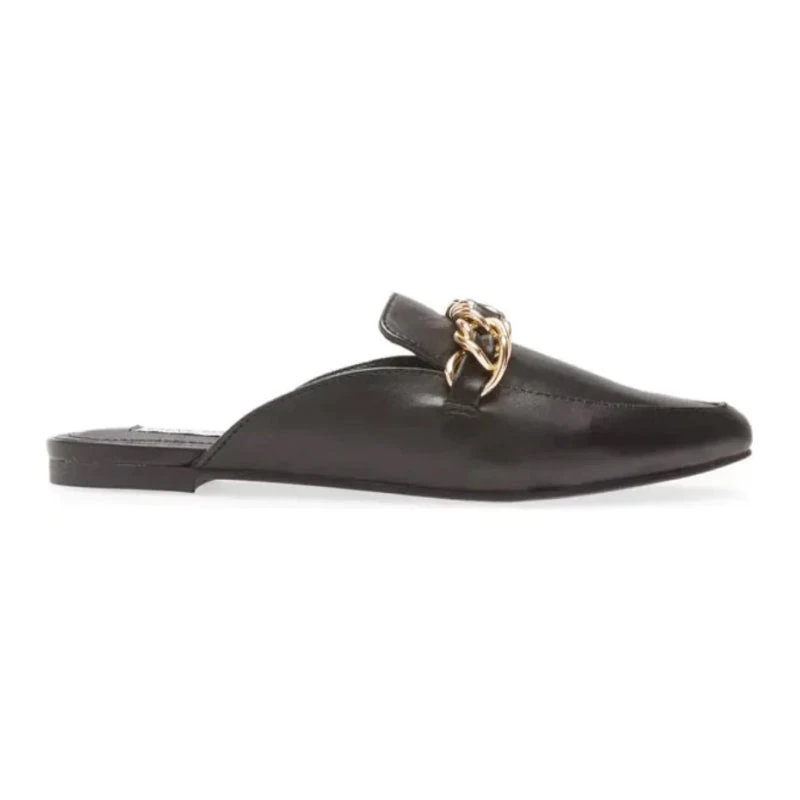 A stylish mule that embodies contemporary adaptability has striking chain-link hardware adorning its vamp.