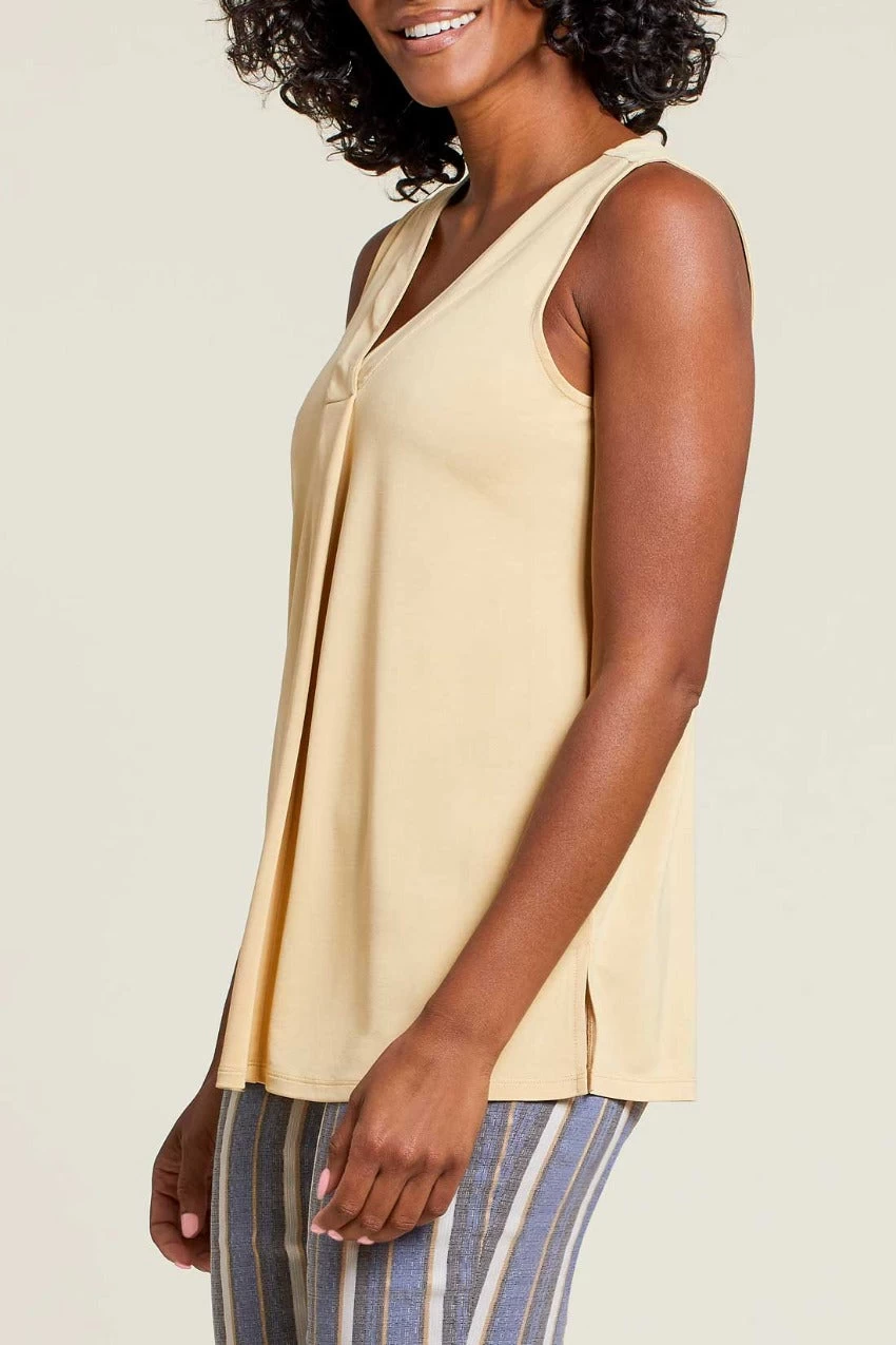 Pop over v-neck, sleeveless top with a flowy fit.