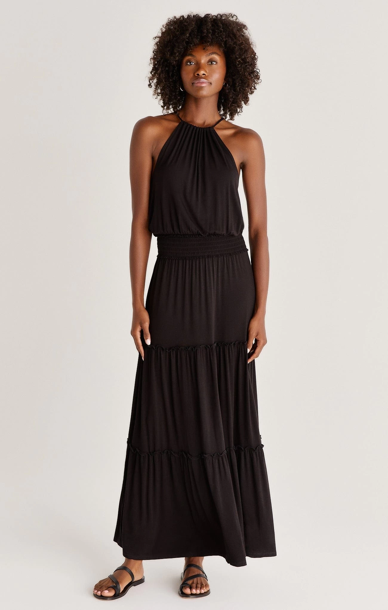 This dress makes getting ready a breeze! The Beverly Sleek Dress is made of our soft Sleek Jersey fabric and features a halter neck, smocked waistband, and tiered maxi length skirt with a slit.