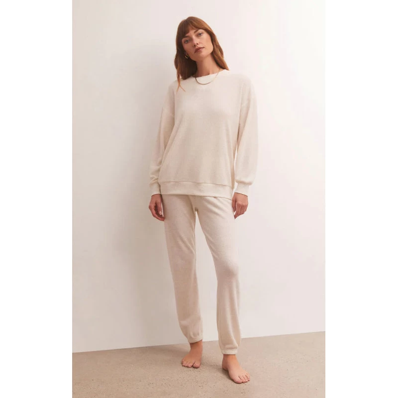 Made using our lightweight and flocked Brushed Mini Thermal fabric, this crew neck long sleeve pullover is perfect for layered fall looks. Semi-sheer in the Light Oatmeal color, this top pairs so well with the Cozy Days Thermal Jogger.