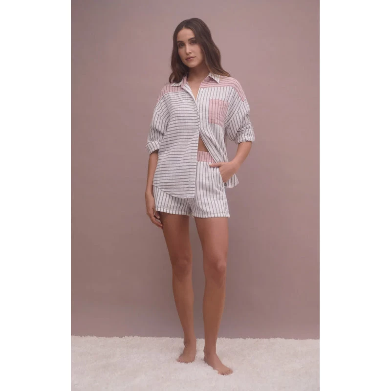 Relaxed and easy to wear, the Hang Out Stripe Boxer is bound to be a new fave. Made using our Textured Double Gauze, this short gets a pop of color from the fun stripe pattern. A faux button placket, elastic waistband and pockets finish this style off. Make it a matching set with the All Mixed Up Stripe Shirt.