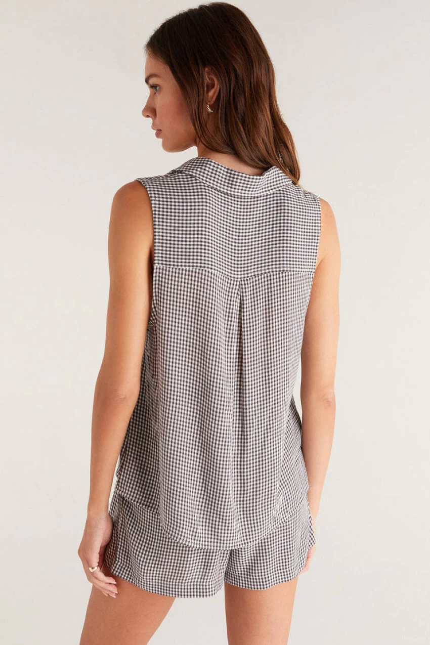 The Harper Gingham Top is made with our Rayon Crepe Gingham fabric and features a straight body and sleeveless button-up design. Pair this colourful classic with the matching Calista Gingham Short.