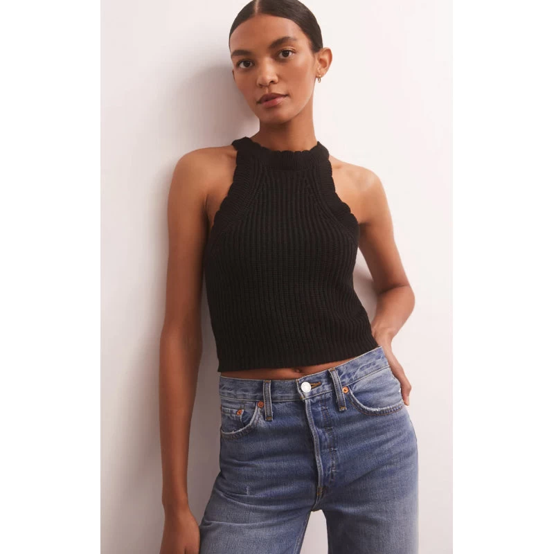 Looking for something a little different? The Oak Novelty Sweater Top is new this season, made using our soft polyester sweater yarns, and features softly scalloped details that elevate this style. This fun top shows a little chest and shoulder for a flirty feel and would look great paired with high waisted styles.